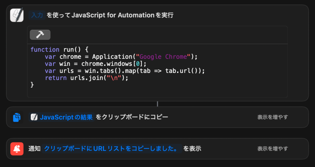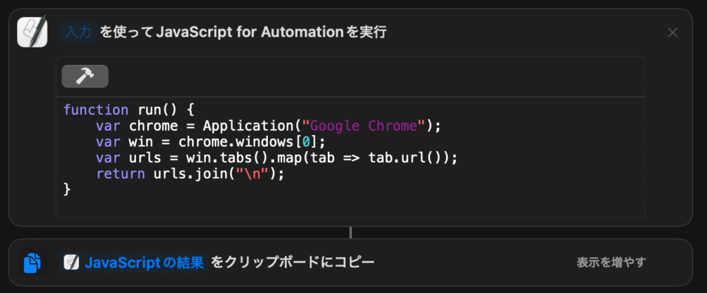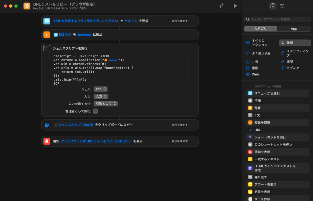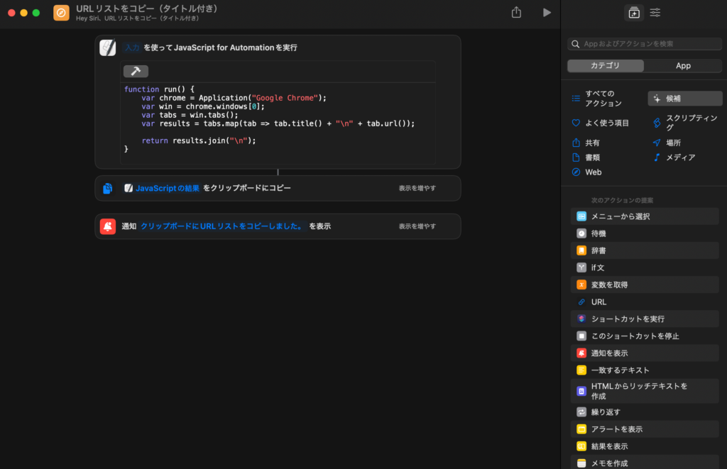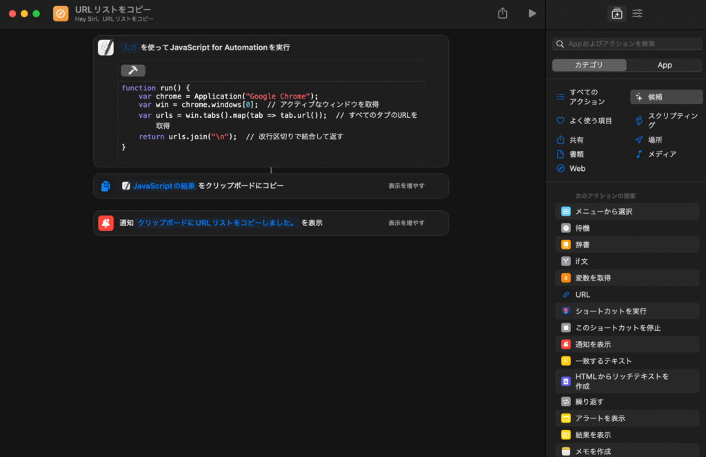 以上の設定で、アクティブウィンドウの全てのタブをURLを取得し、クリップボードにコピーするショートカットの作成が完了しました。