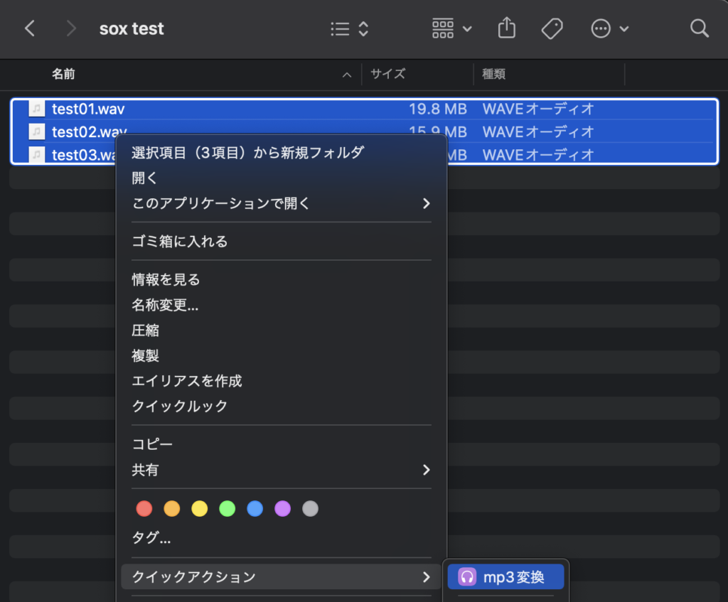 今回はMacのショートカットアプリを使って、Finder上から複数のwavファイルを一括でmp3に変換するショートカットの作成方法をご紹介します。