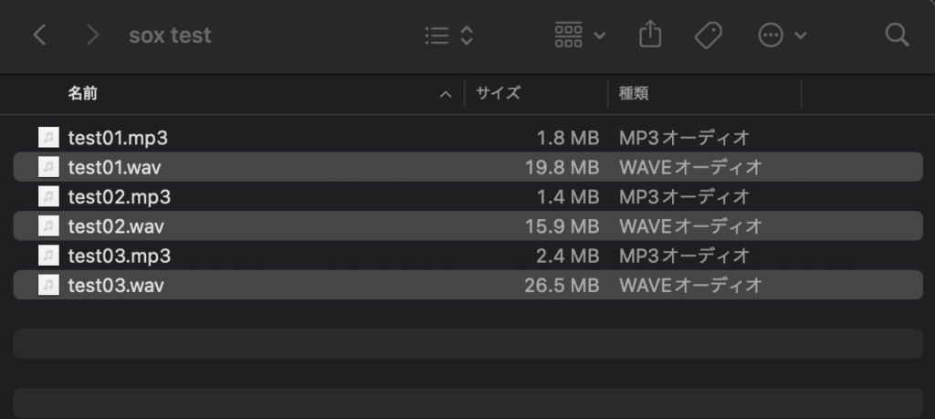 ものにもよりますが、wavからmp3に変換することで、データサイズは約1/10程度まで削減することができます。また、こちらのショートカットですが、元フォーマットはwav以外でも、soxで対応している音声フォーマットであれば変換が可能です。