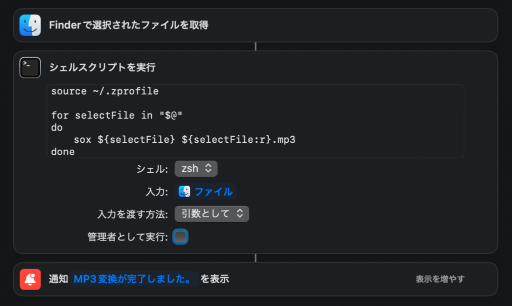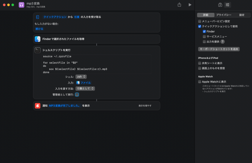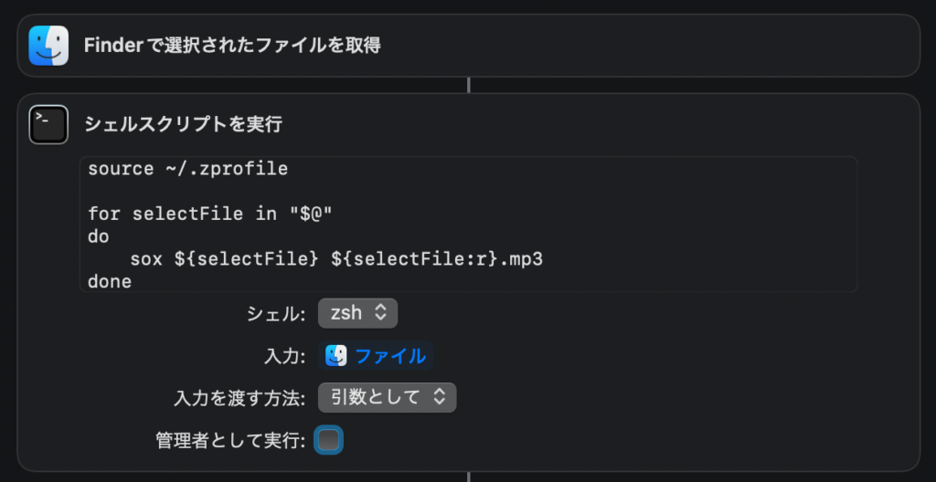 - ショートカットアプリでFinderから選択ファイルを取得し、soxを実行するシェルスクリプトを設定