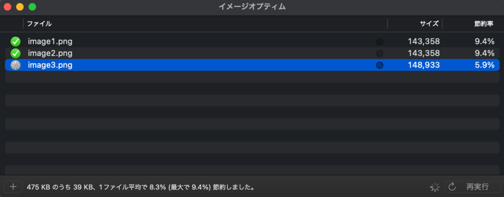 複数のpng画像を選択して実行後、設定したワークフローの完了メッセージが通知されます。その後ImageOptimの画面が立ち上がるので、全ての画像に緑のチェックマークが付いたら圧縮完了です。