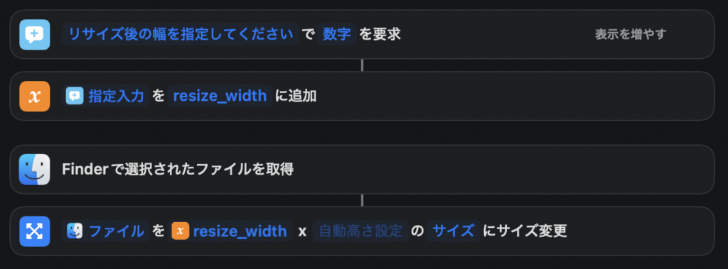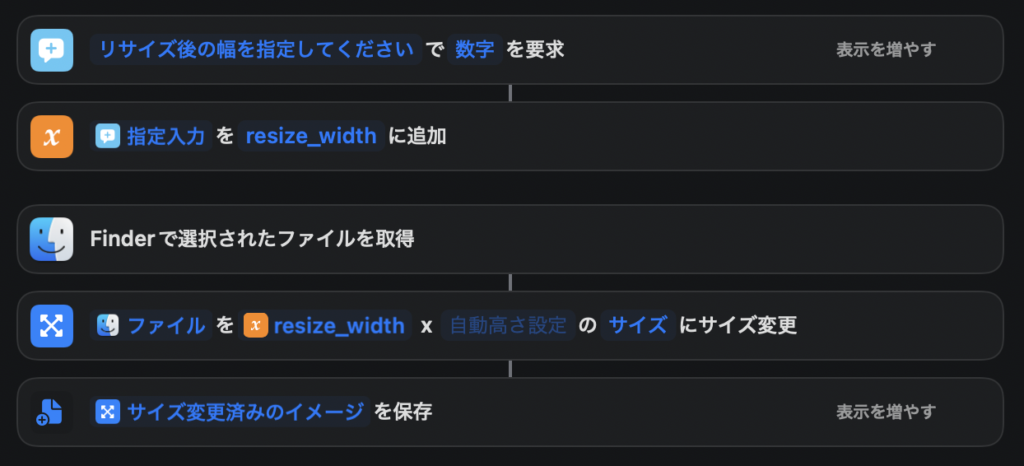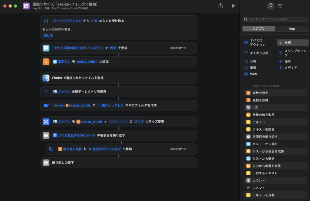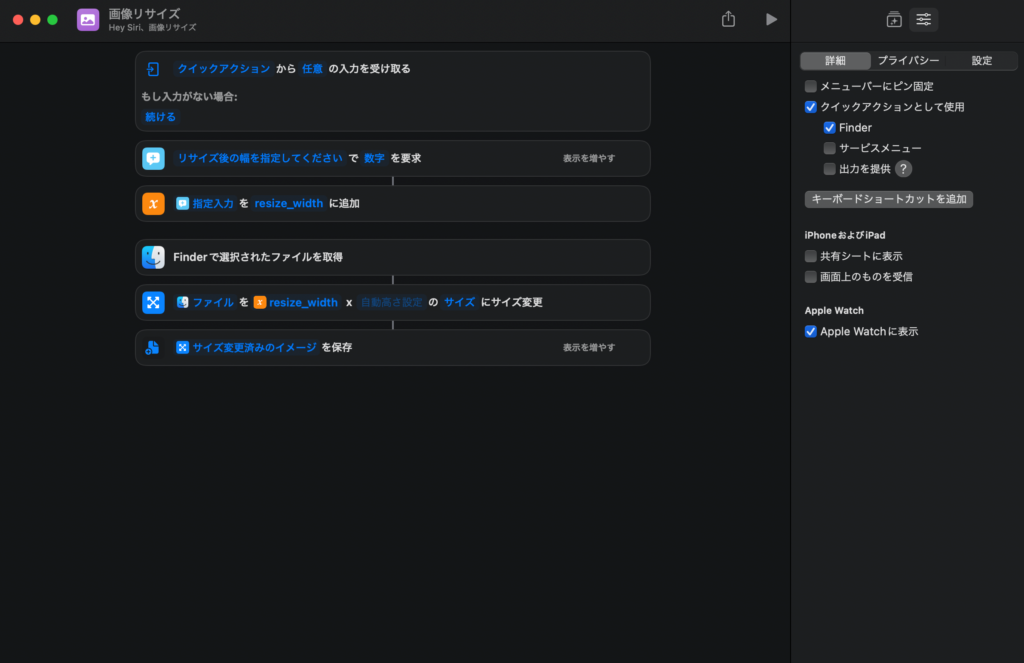 以上の設定で、Finder上の右クリックメニューから実行できる画像リサイズのショートカットの作成が完了しました。