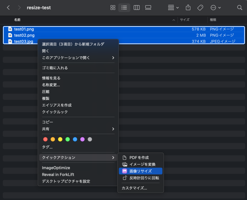 Finderから画像ファイルを選択して右クリックすると、メニューのクイックアクションに今回作成したショートカットが追加されています。