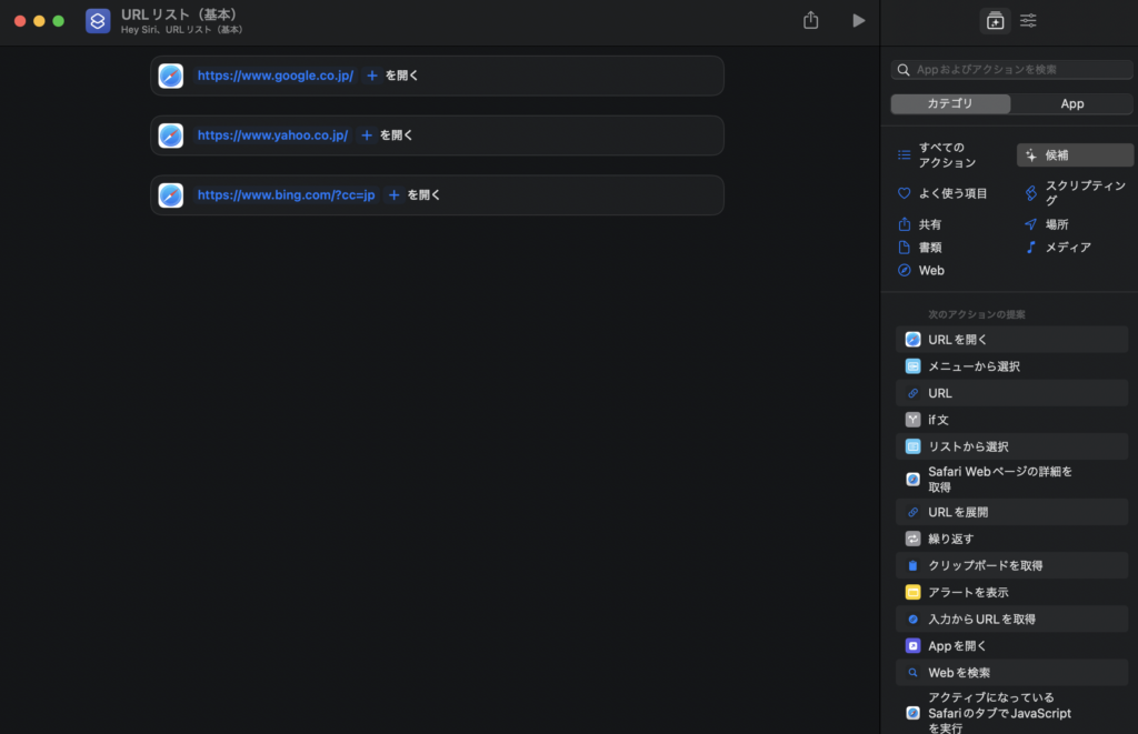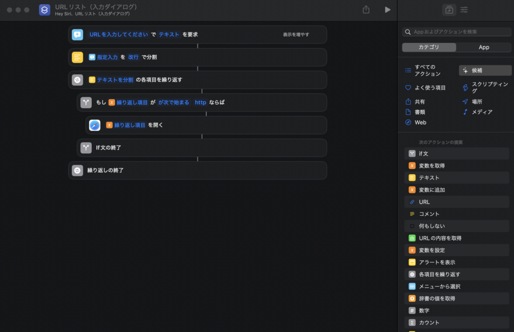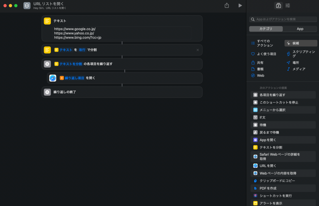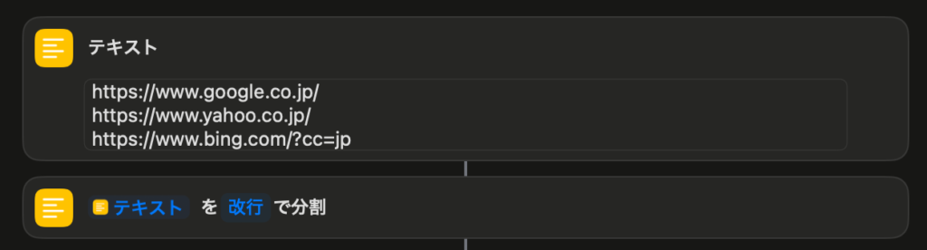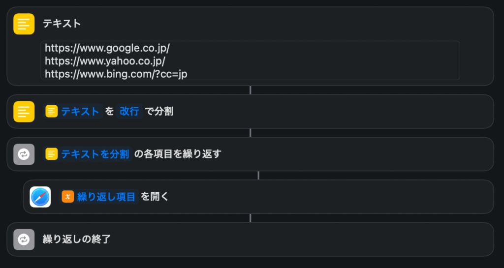 以上の設定でテキストからURLリストを一括で開くショートカットが作成できました。